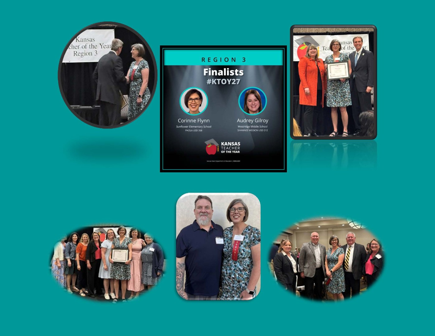Ms. Flynn was supported by her husband Shawn, her building principal, Staci Wokutch, several of her team members from Sunflower Elementary as well as Superintendent, Matt Meek, Asst. Supt., Justin Burchett, and Amy Wright, Director of Curriculum at the event in Overland Park, KS.